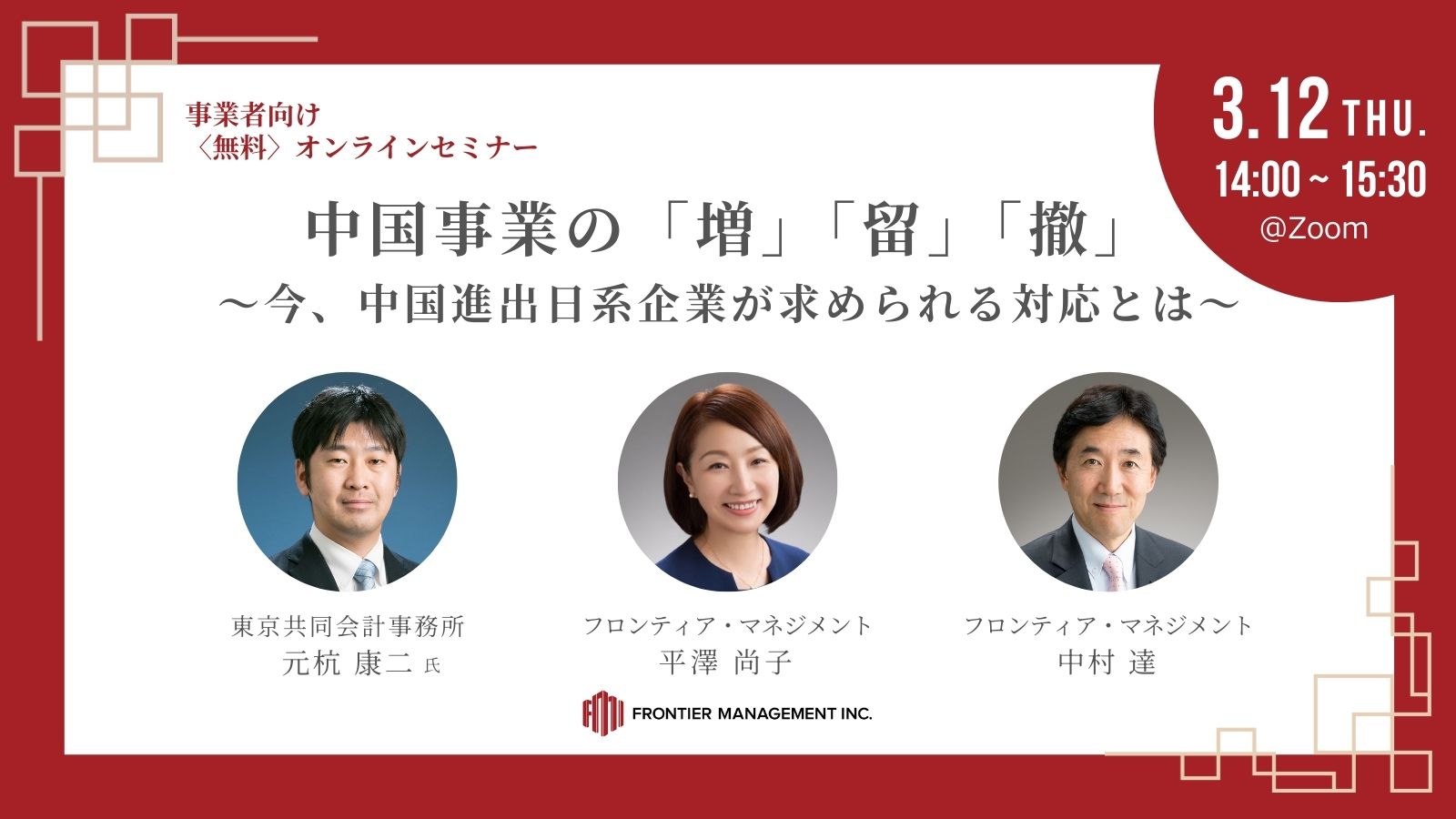 日中関係の冷え込みが続く中、中国に進出している日系企業はチャンスとリスクを見極めたうえでの最適な資源再配置やストラクチャーの再検討がますます急務となったといえます。本ウェビナーでは、中国における日本企業の現在の動向、取り得る対応策、再構築...